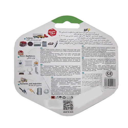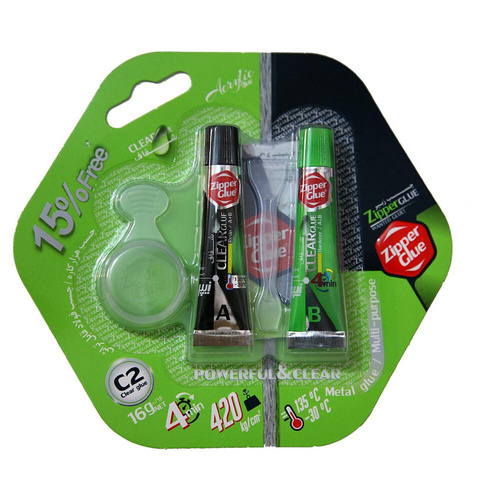 چسب دو قلو شفاف زیپر بسیار قوی و با مقاومت شیمیایی بالا می باشد که قادر است نواع مواد را سریع بهم بچسباند.از قابلیت های چسب دو قلو شفاف زیپر می توان ,توان تحمل حرارتی بین 30- تا 135+ درجه سانتی گراد, تحل کششی 420 kg/cm2, قابلیت خشک شدن سریع در 4 دقیقه, قابلیت رنگ پذیری , تراش پذیری نام برد.بهترین انتخاب جهت چسباندن , ترمیم و درزگیری انواع قطعات فلزی و غیر فلزی مانند قطعات خودرو , لوازم خانگی و قطعات صنعتی به جز PPو PE می باشد.موارد استفاده چسب زیپر بهترین انتخاب برای قطعات شفاف, بهترین انتخاب برای قطعات خودرو, بهترین انتخاب برای لوازم خانگی می باشد.